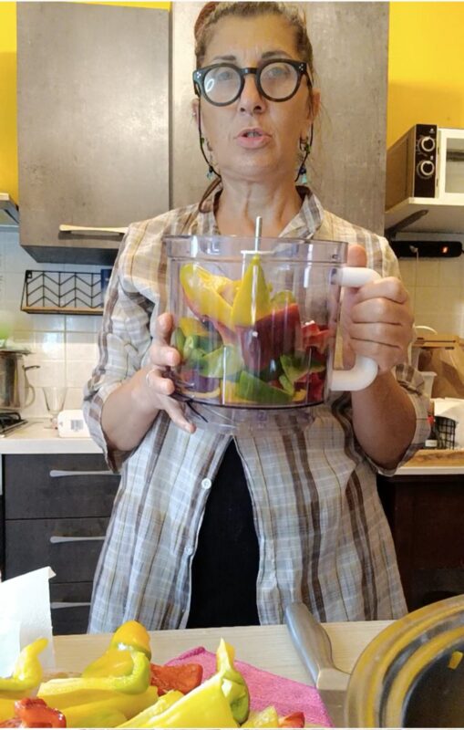 Mixez ou hachez finement le reste des poivrons ; je n’aime pas les moutardes en morceaux, si vous préférez, coupez tout en lamelles ou en morceaux. Si vous aimez, ajoutez aussi deux piments piquants coupés en rondelles
