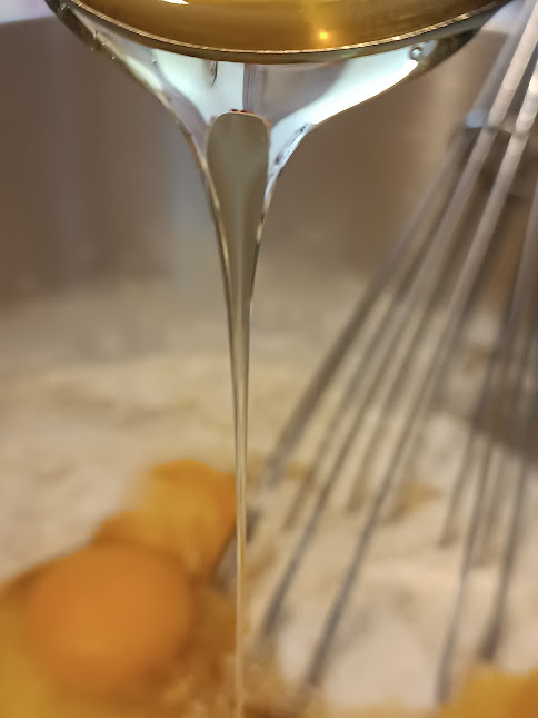 • Dans le bol du robot ou dans un bol en verre, mettez la farine, le sucre et la levure tamisée, mélangez bien et ajoutez le lait, les œufs, l’huile et le miel.