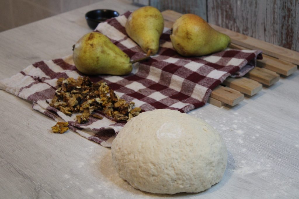 Couvrez avec un bol ou une serviette et laissez lever pendant environ une heure. Pendant ce temps, préparez les noix et les poires. Hachez grossièrement les noix et coupez les poires en tranches.