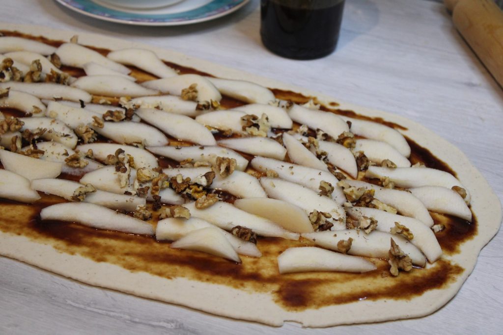 Une fois le temps écoulé, étalez la pâte et donnez-lui une forme rectangulaire ; répartissez le moût de raisin, disposez les tranches de poires et parsemez de noix.
