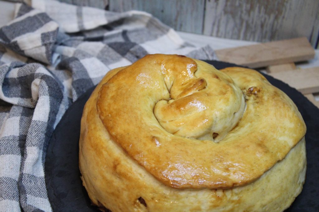 Enroulez la pâte sur elle-même puis formez une spirale. Laissez lever jusqu’à ce qu’elle double de volume et faites cuire dans un four préchauffé à 190 degrés pendant environ 40 minutes.