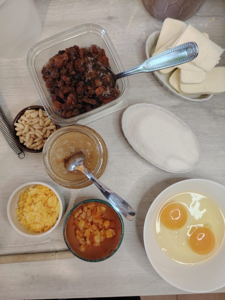 Pignons, raisins secs, fruits confits et farine sont les principaux ingrédients de ce pain sucré
