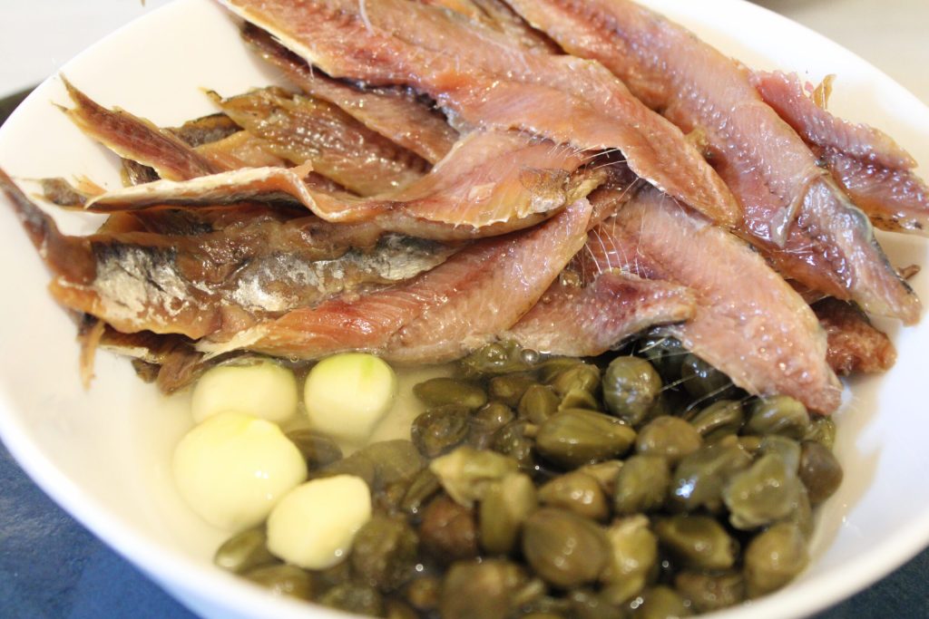 Nettoyez les anchois, l’ail et les câpres et ajoutez le vinaigre. Laissez macérer jusqu’à leur utilisation.
