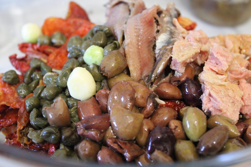 Dans un bol, versez les tomates séchées, les olives, puis ajoutez les anchois, l’ail, le thon et les câpres.