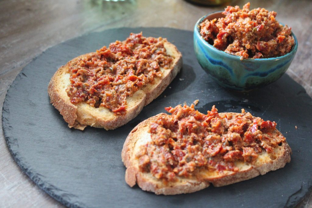 Pesto de tomates séchées avec anchois et olives. Comme cela se produit souvent, certaines recettes sont incontournables dans les réserves de famille chaque année ; en vérité, je n’aime pas beaucoup préparer des conserves sous huile, c’est pourquoi je prépare un pot et je le consomme immédiatement. Ma peur du botulisme, aidée par la disponibilité de ces ingrédients simples désormais disponibles en toute saison de l’année. Ainsi, je peux manger ou offrir ce pesto quand j’en ai envie. Il a une simplicité et une rapidité typiques de ce genre de préparation, je n’utilise pas de pesto mais le robot de cuisine, mes tomates séchées olives, câpres et anchois, que j’achète directement chez le poissonnier. Je peux ainsi compter sur des produits de première qualité. Je préfère manger moins, mais bien. Je suis les saisons et je récupère des fruits et des herbes comestibles dans les champs en friche. Je troque les produits que j’ai en plus, en échange d’autres provisions. Cela me permet d’avoir toujours des aliments locaux de très bonne qualité.