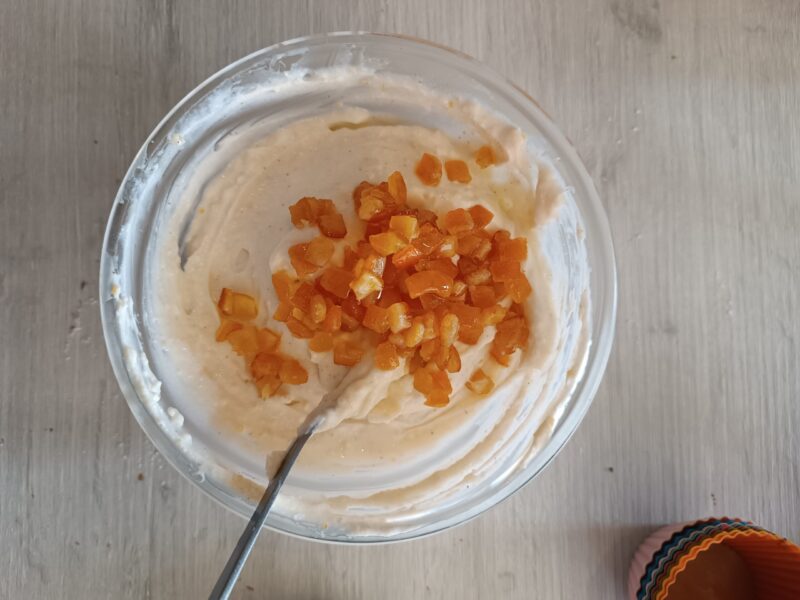 Entre-temps, préparez la ricotta, en vérité cela prend quelques minutes. Mélangez ricotta, oranges confites hachées très finement pour moitié et les autres ajoutées en morceaux, le sucre glace pour obtenir un mélange bien homogène