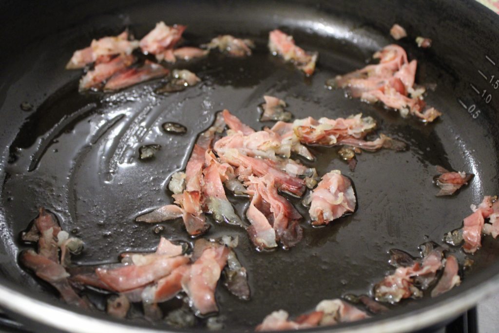 • Coupez le speck en lanières ou, si vous préférez, en petits dés et faites-le revenir à feu doux.