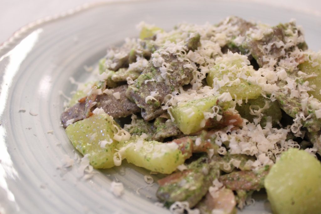 Cette recette capture la fraîcheur du printemps, avec les saveurs chaudes des pommes de terre et du speck qui se marient bien avec le goût amer de la farine de sarrasin utilisée pour faire les pizzoccheri.