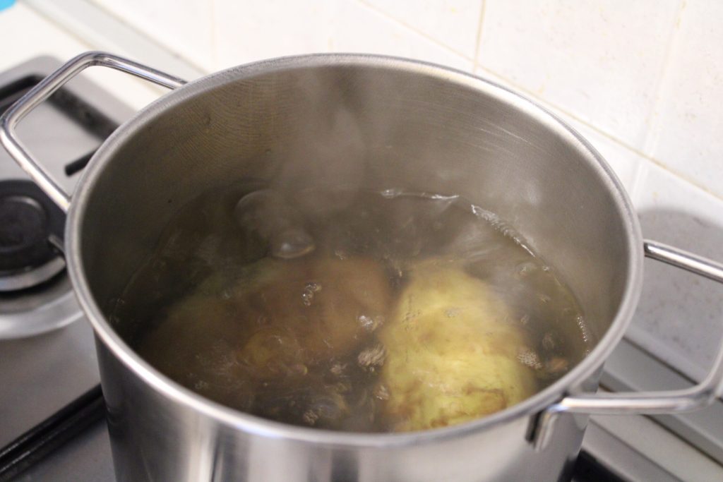 • Lavez les pommes de terre et mettez-les à cuire dans de l’eau froide, ajoutez du sel et cuisez. Elles doivent être tendres.