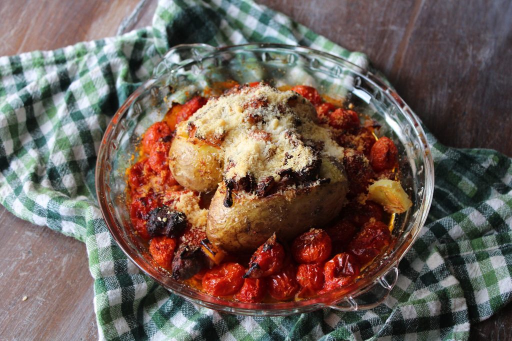 • Préparez maintenant le plat pour le four : au fond, mettez les tomates cerises, puis les pommes de terre farcies. Faites rôtir au four ou à la friteuse à air. Le four à bois ou la cheminée sont excellents.