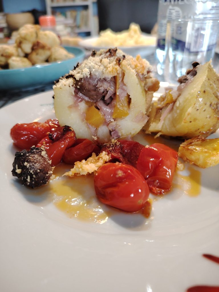 Pommes de terre rôties farcies à la saucisse et… Un plat qui pourrait sembler hivernal à beaucoup, mais que vous pouvez préparer et consommer en toutes saisons. En hiver car il est agréable de manger quelque chose de chaud, tandis que pendant la belle saison, avec la bonne compagnie, c’est fantastique pour un dîner rustique dans le jardin.