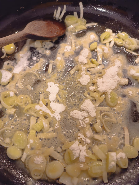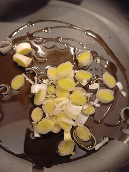 • Dans une poêle, faites revenir le poireau coupé en rondelles pour les ramollir