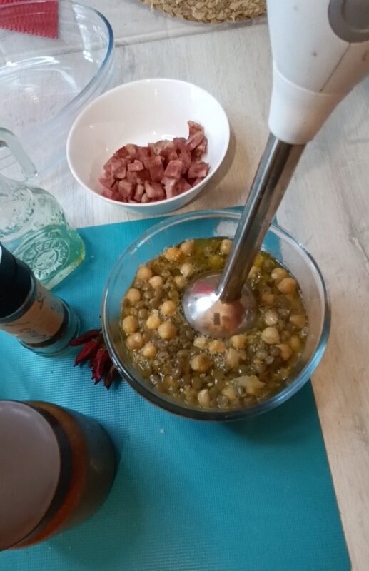 Dans une casserole, faire revenir le soffritto et ajouter les lentilles et les pois chiches, bien les assaisonner…