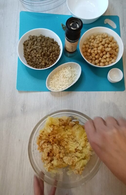 Après avoir préparé tous les ingrédients, mélanger dans un bol, la moitié des pois chiches bouillis et écraser les pommes de terre avec une fourchette et réduire en une purée granuleuse