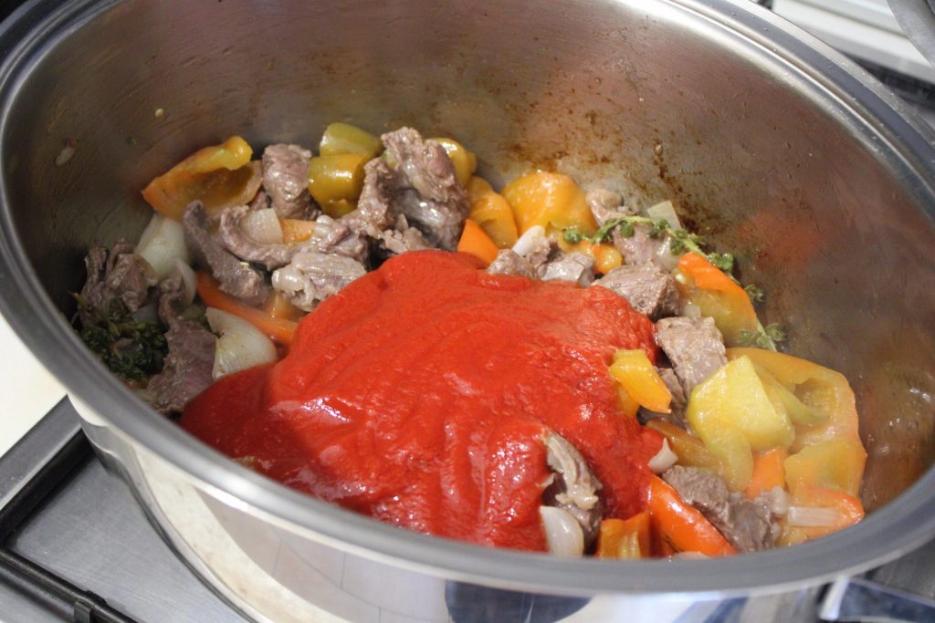 • Coupez tous les légumes et la viande en morceaux pas trop petits. Dans une casserole, mettez l’huile et tous les ingrédients. Ajoutez le verre de vin et un verre d’eau. Faites cuire à feu doux jusqu’à réduction presque totale.
