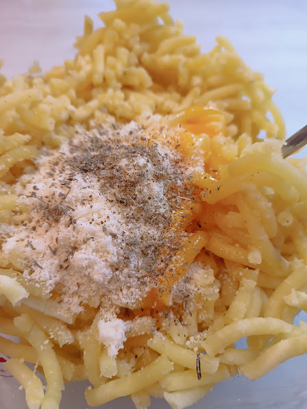 • Après avoir fait cuire les pommes de terre, passez-les au presse purée, je préfère le faire quand elles sont encore chaudes, car en refroidissant, les gnocchi restent plus compacts, et ajoutez le Castelmagno râpé, la farine et l’œuf; généralement je ne mets pas de sel dans les gnocchi, donc je vous laisse le choix. J’ai ajouté une pincée d’herbes aromatiques mélangées, conseillée par une chère amie de la région de production.