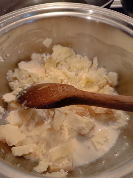 • En attendant, coupez le fromage en petites lamelles, ou râpé et faites-le fondre dans le lait, si vous préférez au bain-marie.