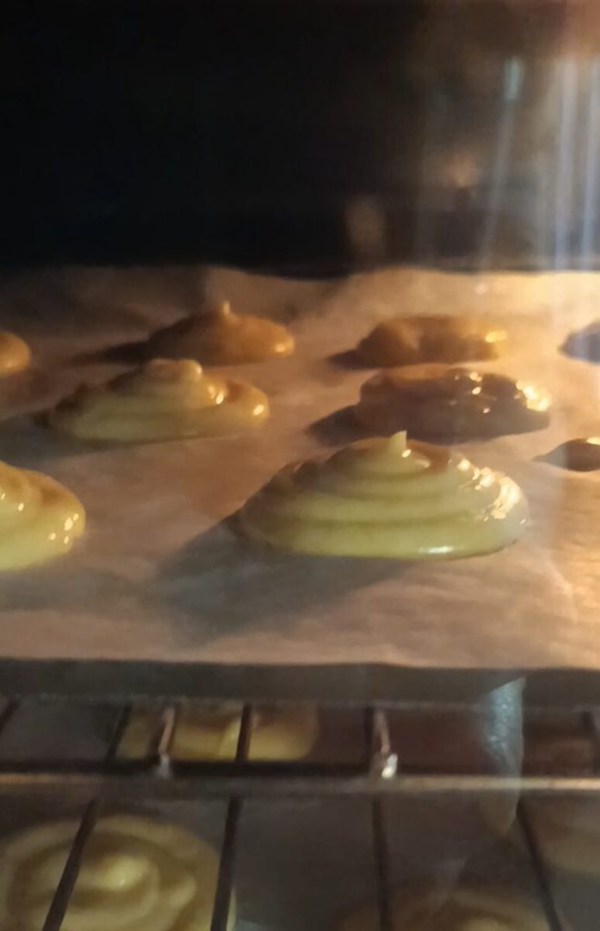 • Avec une poche à douille, disposer sur la plaque et enfourner à four chaud à température : 200 degrés pendant environ 25 – 30 minutes. Laissez bien sécher avant de sortir du four, sinon elles se dégonflent.