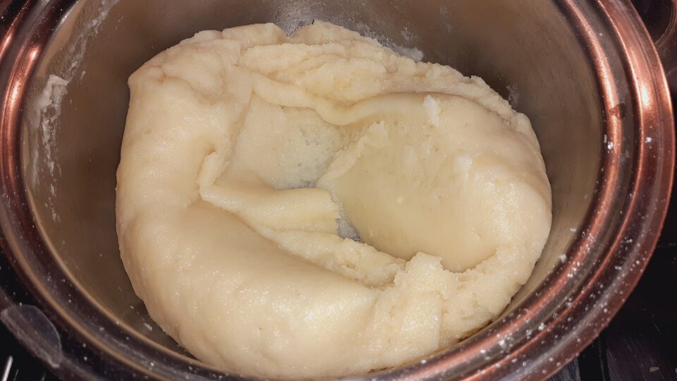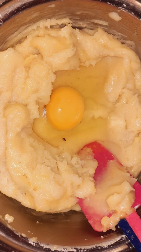 • Mettre l’eau avec le beurre et le sel sur le feu. Quand le beurre est complètement fondu, attendre que le liquide atteigne l’ébullition et fasse une mousse, puis ajouter la farine; mélanger continuellement. Une boule homogène se formera. Quand elle se détache des parois, il est temps de retirer du feu et de transférer dans le bol où vous ajouterez les œufs