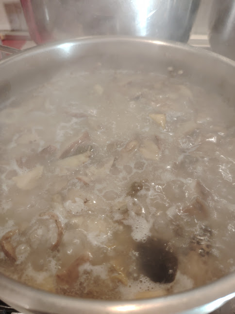 • Dans la casserole choisie, faites revenir à feu doux, les champignons et les châtaignes bouillies coupées en morceaux, ajoutez ensuite le riz ; généralement on fait d’abord griller le riz, dans ce cas d’abord les champignons ; mélangez bien et