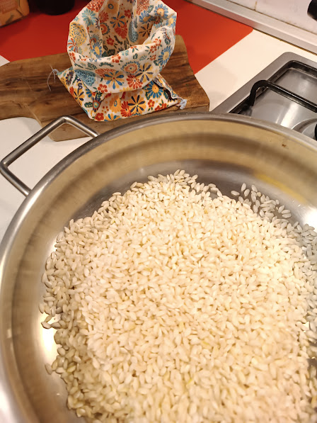 Dans une casserole, faites griller le riz et le mélange pour soffritto, ajoutez le bouillon de légumes petit à petit et faites cuire à feu doux.