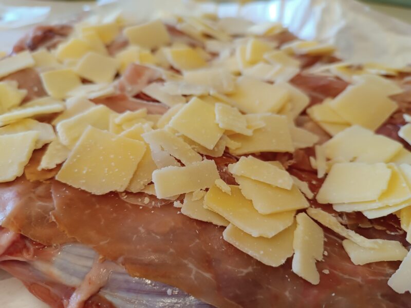Pour compléter l’œuvre, disposez la deuxième couche de jambon ; ne salez pas, vous vous retrouveriez avec un rôti salé!