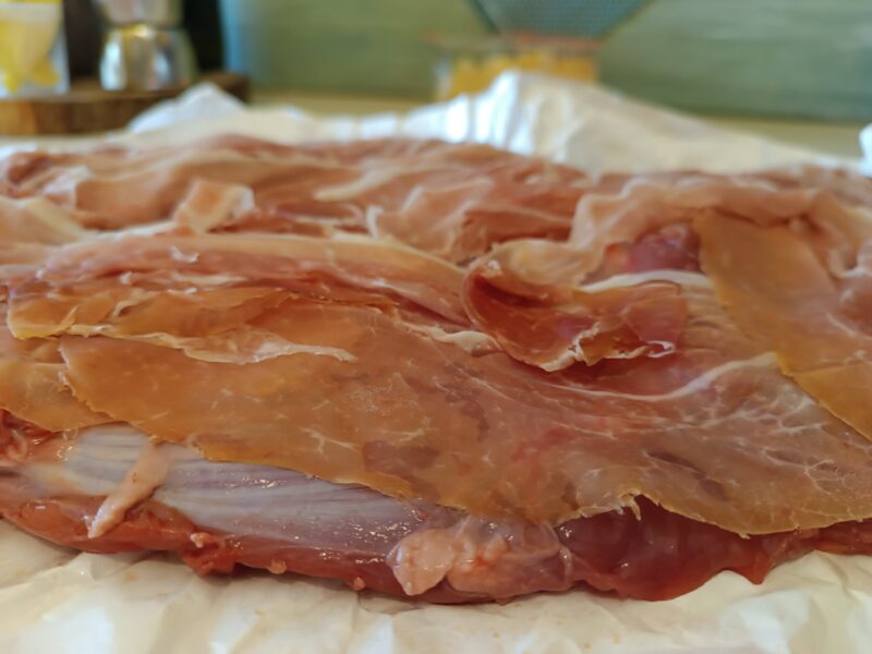 Étalez votre belle tranche de viande sur le plan de travail, j’ai laissé son papier en dessous pour mieux me débrouiller avec les mouvements ; faites une couche avec la moitié du jambon en couvrant toutes les parties