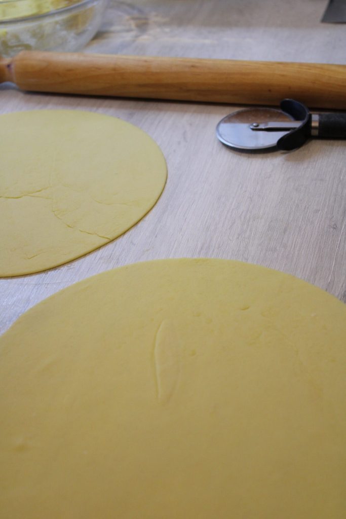 Vous pouvez maintenant étaler la pâte et former des cercles de 20 cm de diamètre, remplissez avec les oignons et pommes de terre