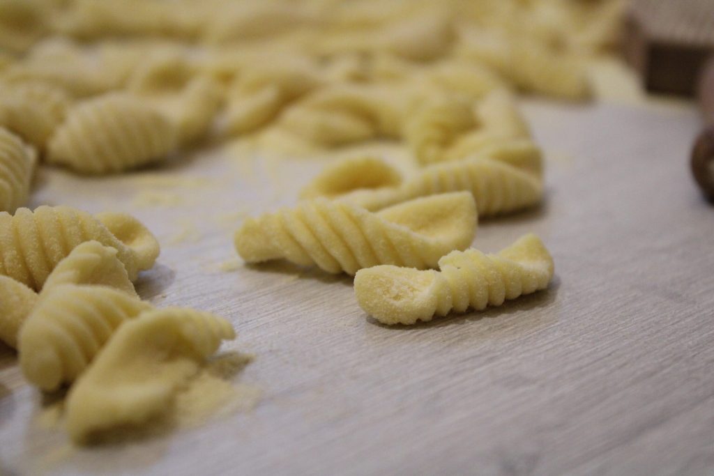 • Entre-temps, préparez les pâtes : découpez des bâtonnets que vous couperez en petits morceaux, puis passez-les sur le rigagnocchi pour créer des boucles.