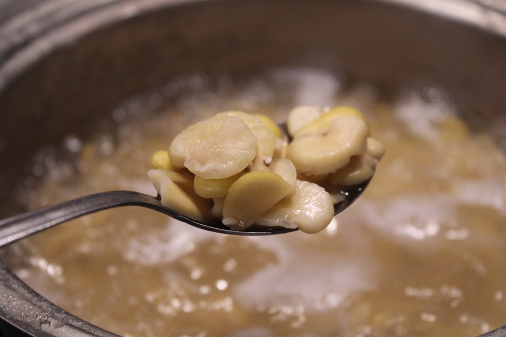 • Tout d’abord, lavez les fèves. Dans une grande casserole, faites revenir l’oignon et un piment, ajoutez les fèves et de l’eau jusqu’à les couvrir, salez et faites cuire. Il faudra environ une heure et demie.