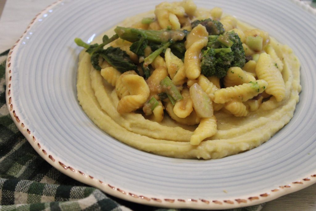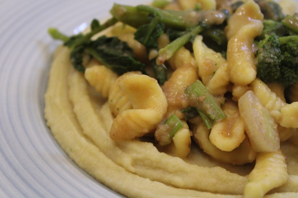 • Le plat sera présenté avec une base de purée de fèves bien chaude et les pâtes au centre. C’est un premier plat vraiment délicieux, riche en arômes.