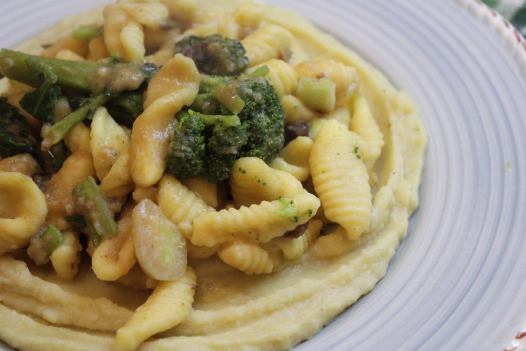 Ce plat rappelle un peu la Basilicate et un peu les Pouilles. Les fèves sèches, je les ai toujours consommées ; nous les faisions sécher nous aussi, lorsque nous avions un grand potager. Les brocolis ne manquent jamais pendant l’hiver et la pâte fraîche a toujours été ma passion.