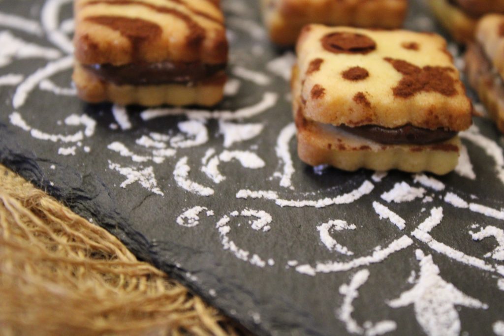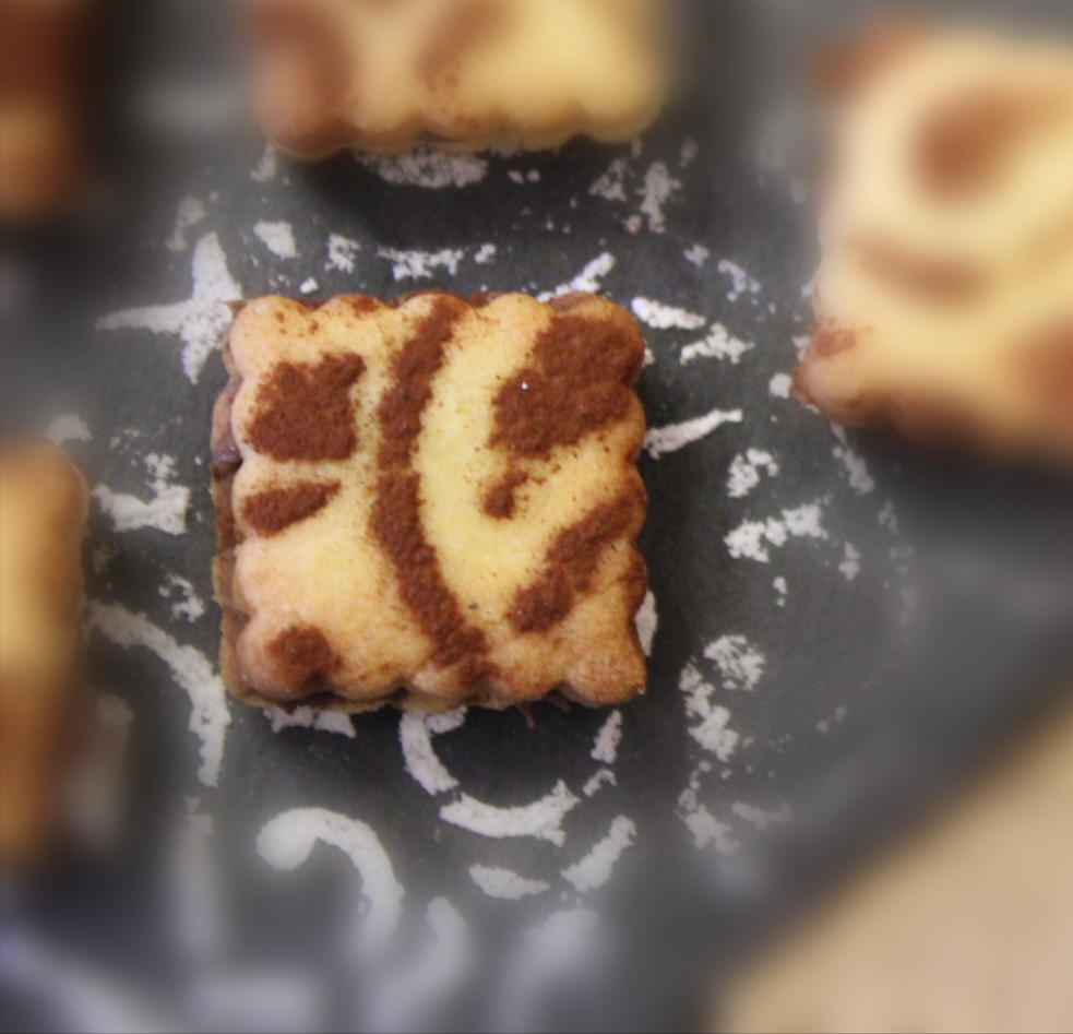 Pâte sablée au goût d’orange, crème à la noisette, Nutella va très bien, ou chocolat noir. Fini avec un pochoir et pour de petites décorations avec du cacao amer.