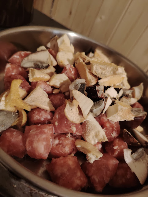 Mais revenons à notre recette, polenta, champignons, châtaignes et saucisse….Ingrédients de culture rurale, de cuisine rustique d’hiver savoureuse, riche en arômes et chaleur.