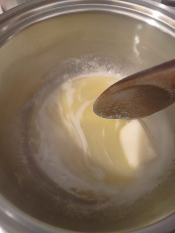 Commencez à préparer la béchamel; faites fondre le beurre dans une grande casserole (comme ça vous n’aurez pas besoin d’en utiliser une autre pour terminer la garniture, moins de vaisselle à laver😜) Ajoutez la farine et mélangez bien; enfin, versez le lait, mélangez bien jusqu’à obtenir un mélange homogène.