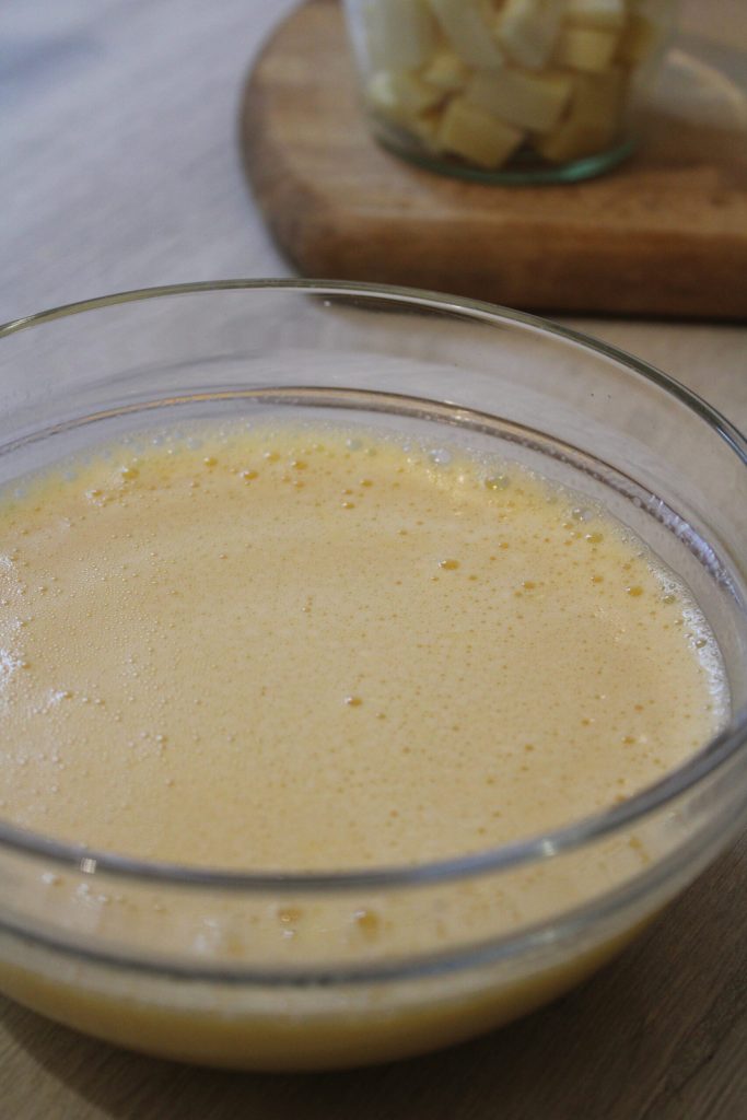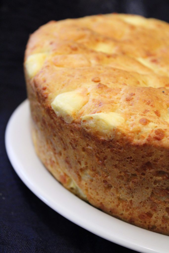 Transférez la pâte dans un moule à bords hauts (j’ai utilisé le moule à chiffon cake) et laissez-la lever pendant environ trois heures, ou jusqu’à ce qu’elle double. Le contenu en fromages ralentit un peu la levée : attendez.