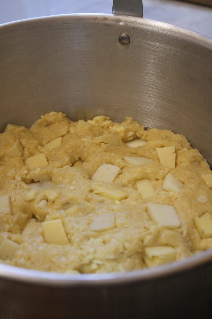 Enfin, ajoutez le gruyère et pétrissez encore pour bien répartir le fromage.