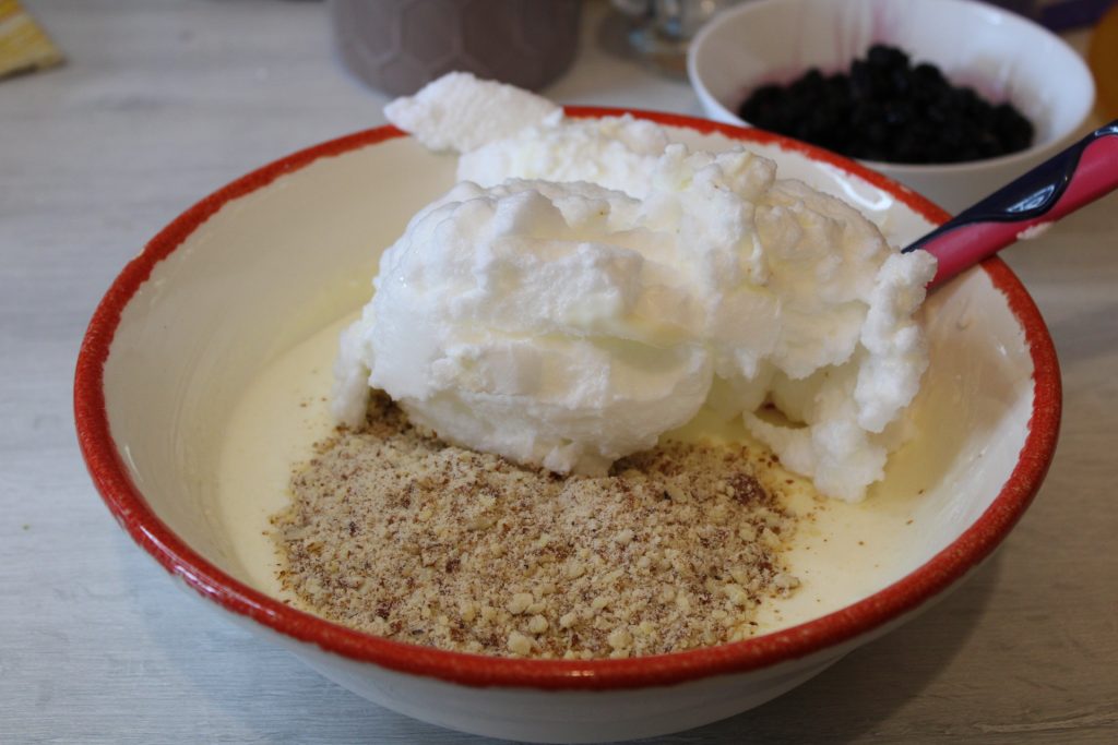 • Pendant que cela refroidit, préparez la frangipane. Mélangez tous les ingrédients: 200 grammes de sucre, farine d’amandes, jaunes d’œufs, fécule et ricotta. Ajoutez les blancs d’œufs après les avoir montés en neige bien ferme;