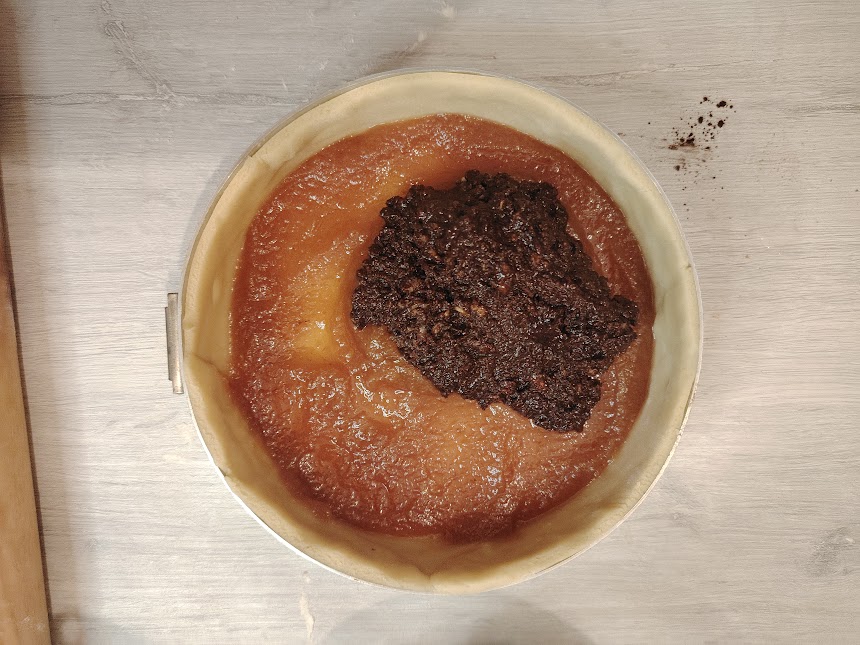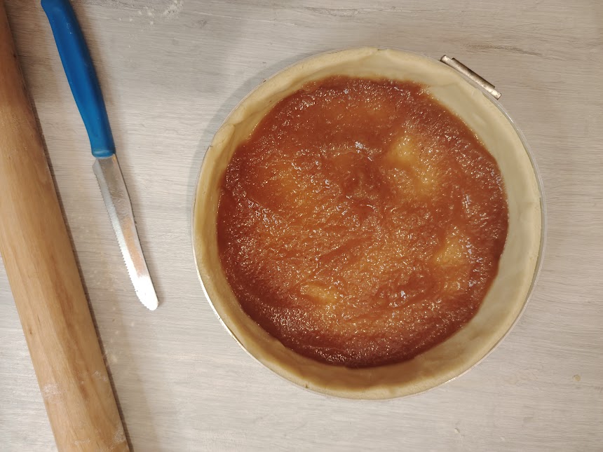 Étalez la pâte et tapissez le moule, égalisez les bords, versez la compote au fond et laissez au réfrigérateur jusqu’à utilisation.