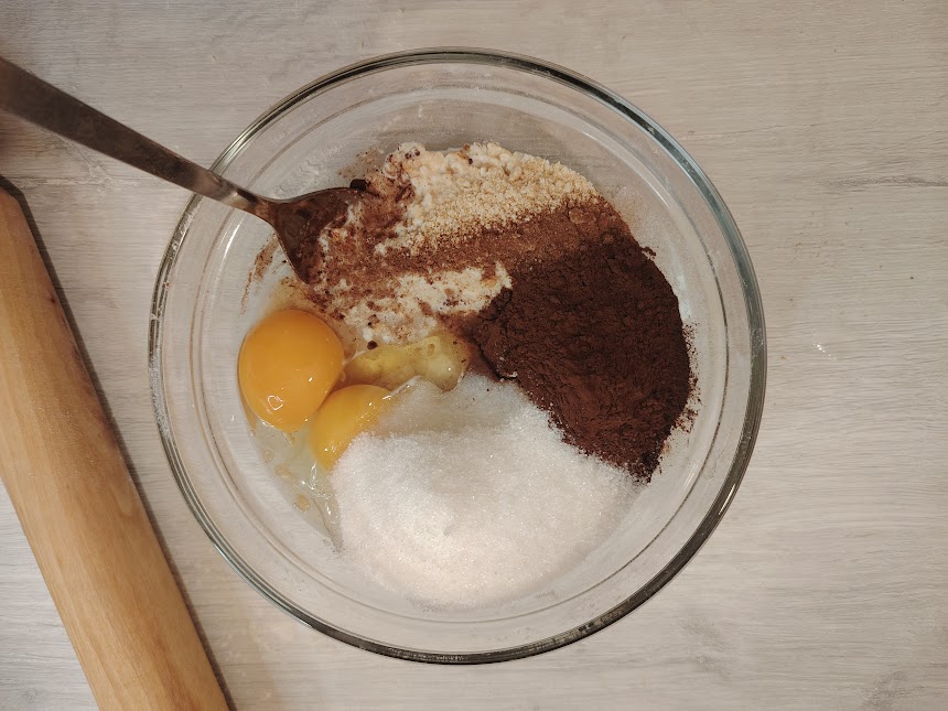 Dans un bol, versez les biscuits à la cuillère émiettés, les œufs, le cacao, le sucre, le lait et la cannelle ; mélangez bien et…
