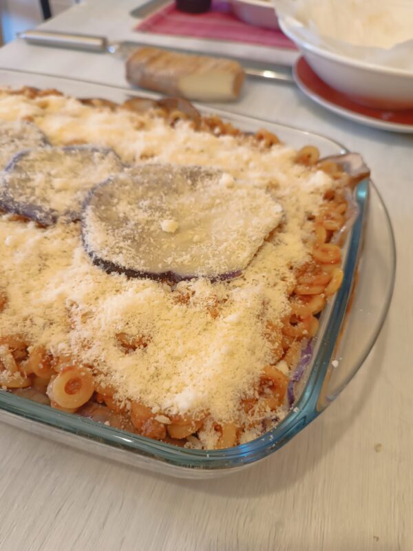 • Vous pouvez encore faire une couche d’aubergines ou non, j’ai préféré seulement quelques tranches, puis j’ai bien ajouté une belle couche de pecorino et mis au four jusqu’à bien gratiner et former une belle croûte