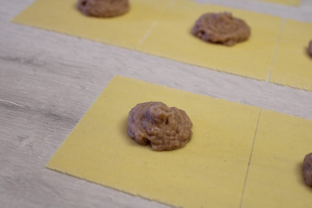 • Avec l’aide de la machine à pâte ou du rouleau à pâtisserie, selon vos choix, étalez la pâte et découpez des carrés de côtés d’environ 6-7 cm que vous repliez en deux pour donner ensuite la forme du tortelli.