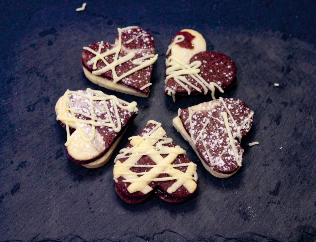 Étalez les pâtes sablées et formez vos motifs ; pour cette occasion j’ai découpé des coeurs bicolores, bien sûr toute forme est la bienvenue.