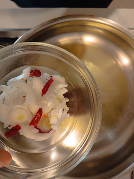 Comme écrit ci-dessus, nettoyez et coupez en petits morceaux le potiron, et réservez-le, émincez l’oignon…