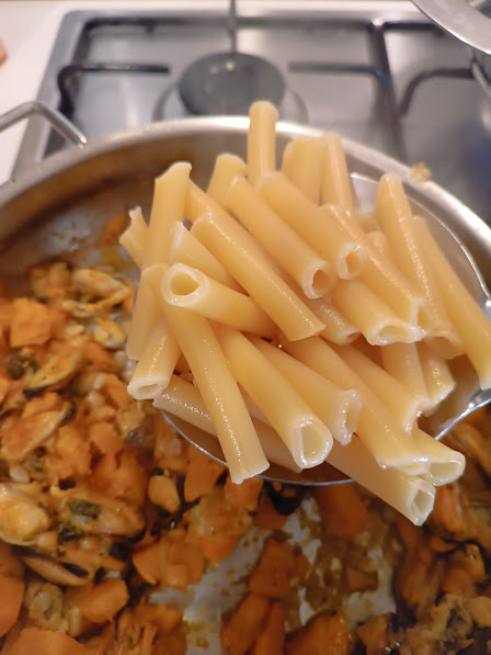 Entre-temps, cassez les ziti et faites-les cuire dans de l’eau bouillante salée, terminez la cuisson en les laissant al dente et ajoutez-les à la sauce de potiron et moules…Mélangez soigneusement et votre plat principal est prêt!