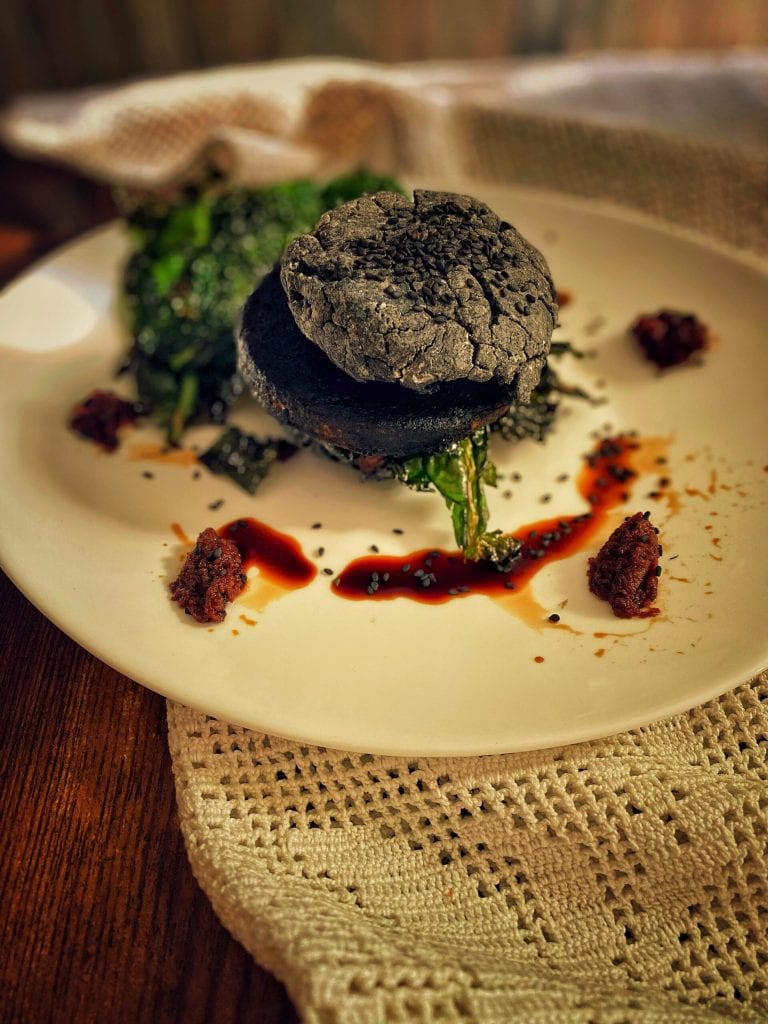 Bun, sans gluten et sans lactose, au charbon végétal avec des graines de sésame noir farci avec un fish burger de morue et encre de seiche cuit dans la sauce soja, accompagné de chips de chou kale et compote sucrée d’olives taggiasche.