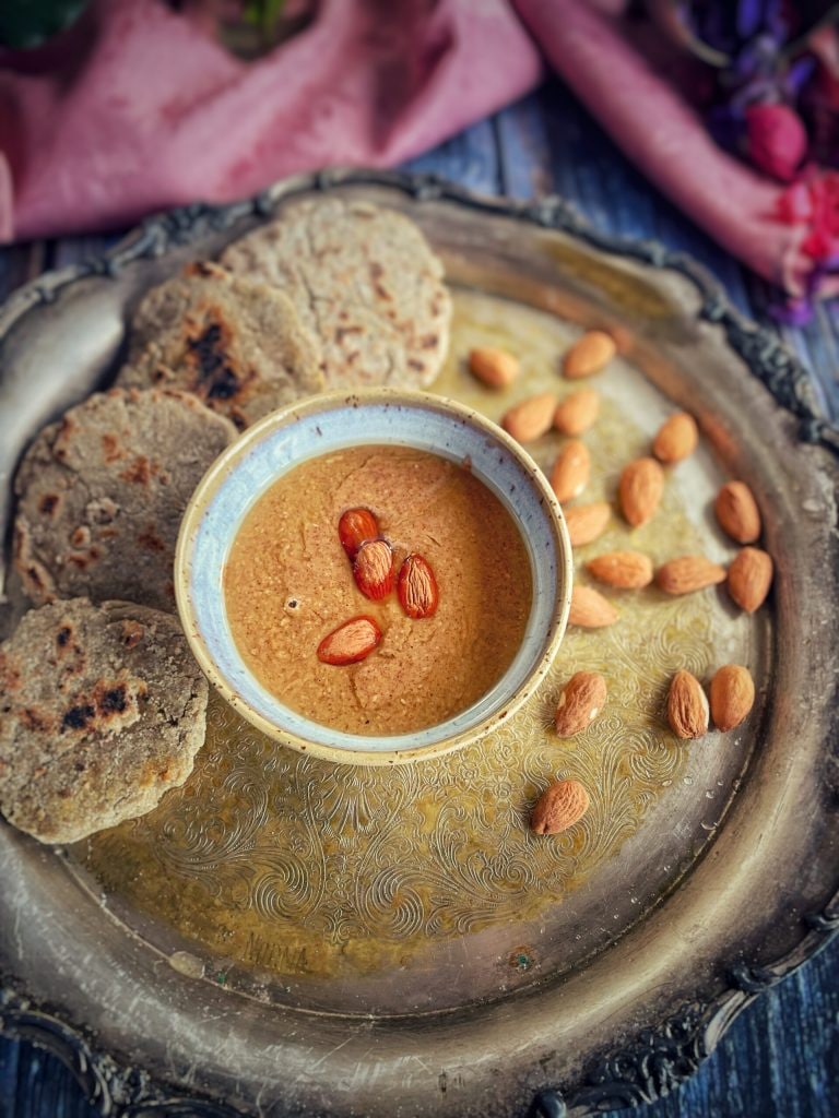 L’Amlou, ou amlu, est une pâte à tartiner à base d’amandes, de miel et d’huile d’argan, originaire de la région amazighe du Souss, dans le sud du Maroc, souvent servie au petit déjeuner ou lors du thé de l’après-midi, accompagnée de pain traditionnel comme msemmen, baghrir ou harcha (comme sur la photo).