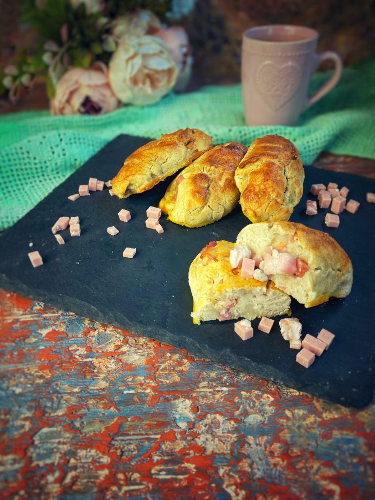 Découper 12 triangles, avec la base face à vous. Ajouter la garniture de jambon cuit et de bacon (et/ou de fromage). Replier les côtés et rouler.