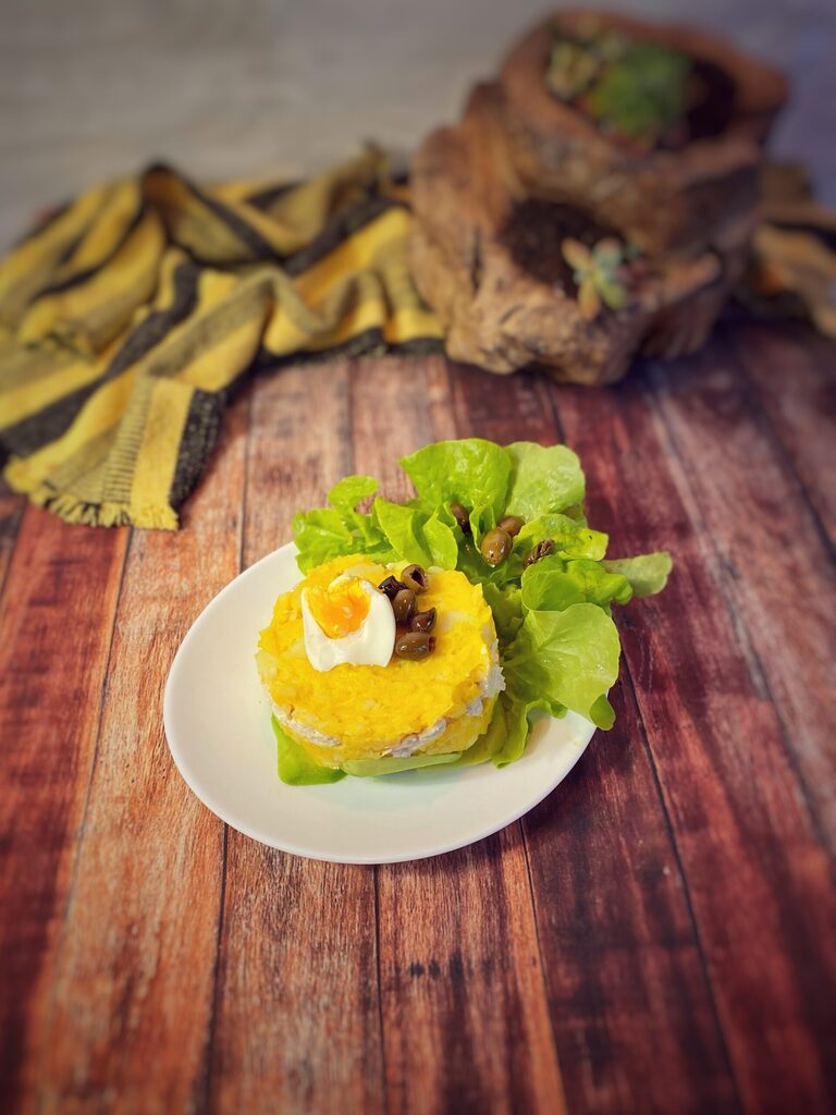 Ce plat est traditionnellement préparé en effet avec : pommes de terre jaunes, citron, œuf dur, aji amarillo, mayonnaise et olives noires.