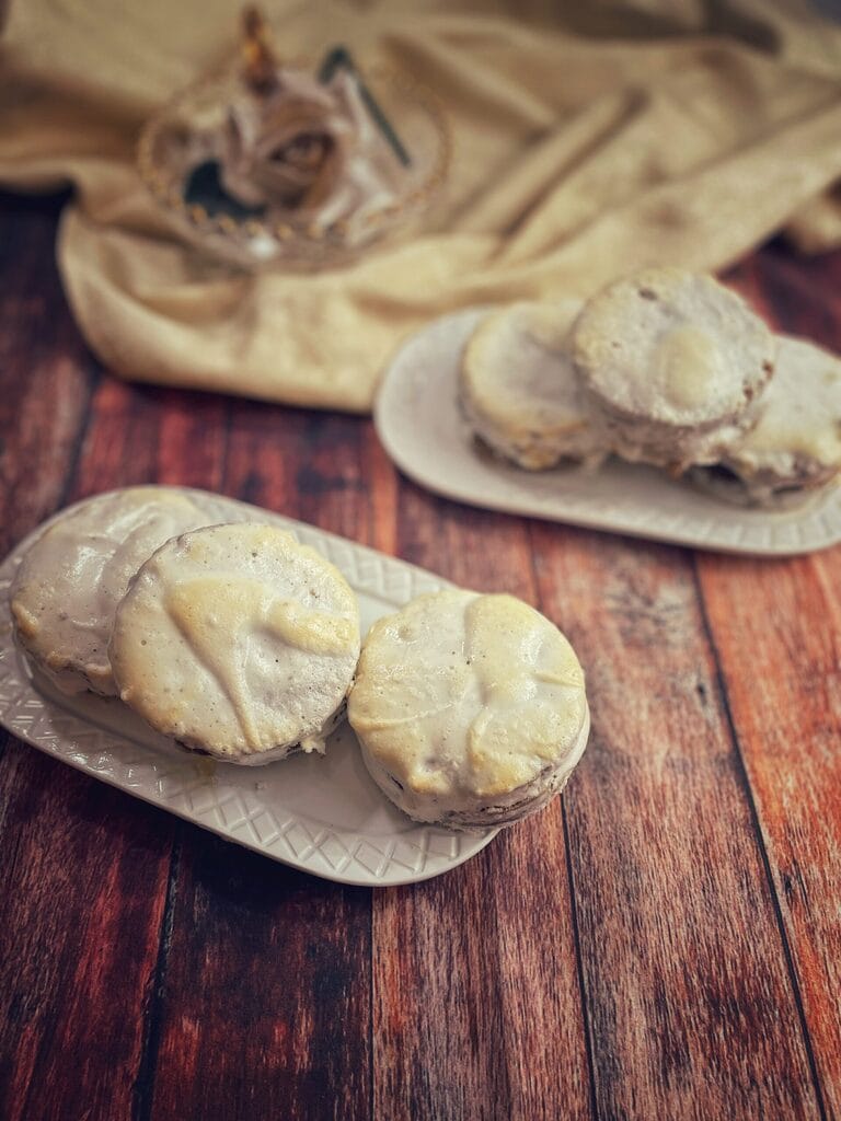 Ces douceurs, très similaires aux alfajores, sont composées de deux disques de pâte fine et croustillante, garnis de manjar (dulce de leche) et souvent recouverts d’un glaçage de meringue et de sucre glace.
